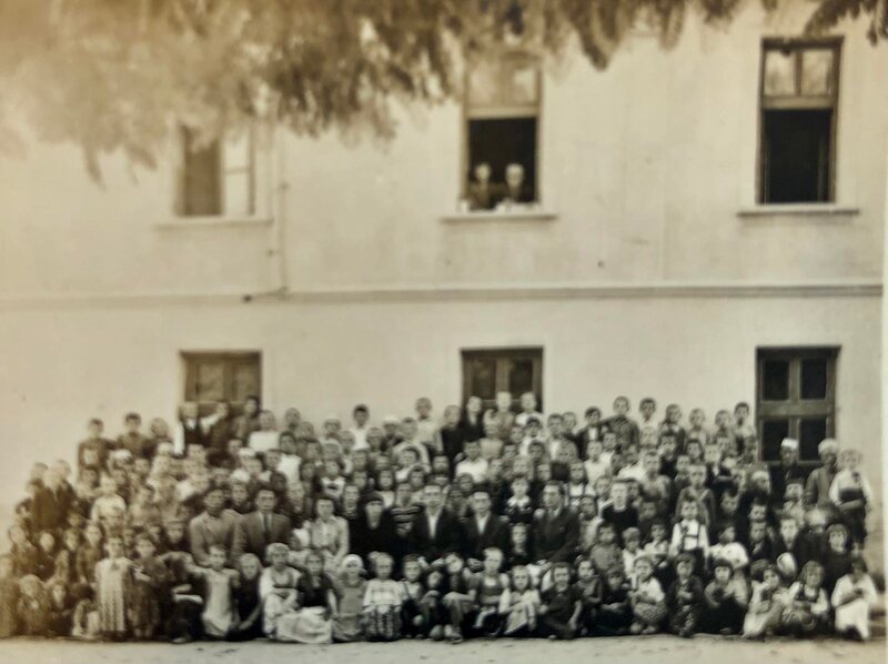 Kolektivi mësues nxënës më 29 korrik 1944 në oborrin e shkollës Mojsi Golemi, Kërçovë, në ditën e mbyllje se vitit mësimor , në qënder ulur afer tim eti zoti Rexhep Sadiku kryetar i komunës , në krah të djathtë të tij drejtori Fadil Hoxha , mësuesja Athina Dinisqoti , Aferdita Gjylapi , Jorgji Bekteshi ,etj